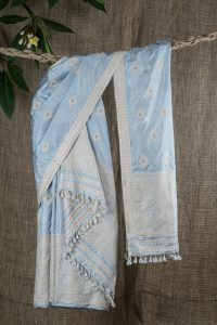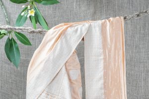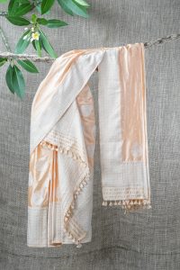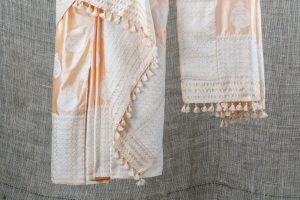 Elevate your wardrobe with this stunning grey Pat silk mekhela chador with gold motifs, a perfect blend of elegance and tradition. Crafted from premium Pat silk, the mekhela features a soft, lustrous drape that enhances your natural grace. Paired with an intricately designed chador adorned with delicate grey gold motifs, this ensemble reflects the rich weaving heritage of Assam.